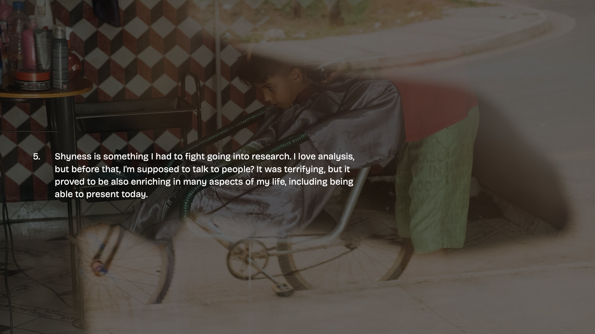 - Shyness is something I had to fight going into research. I love analysis, but before that, I’m supposed to talk to people? It was terrifying, but it proved to be also enriching in many aspects of my life, including being able to present today.