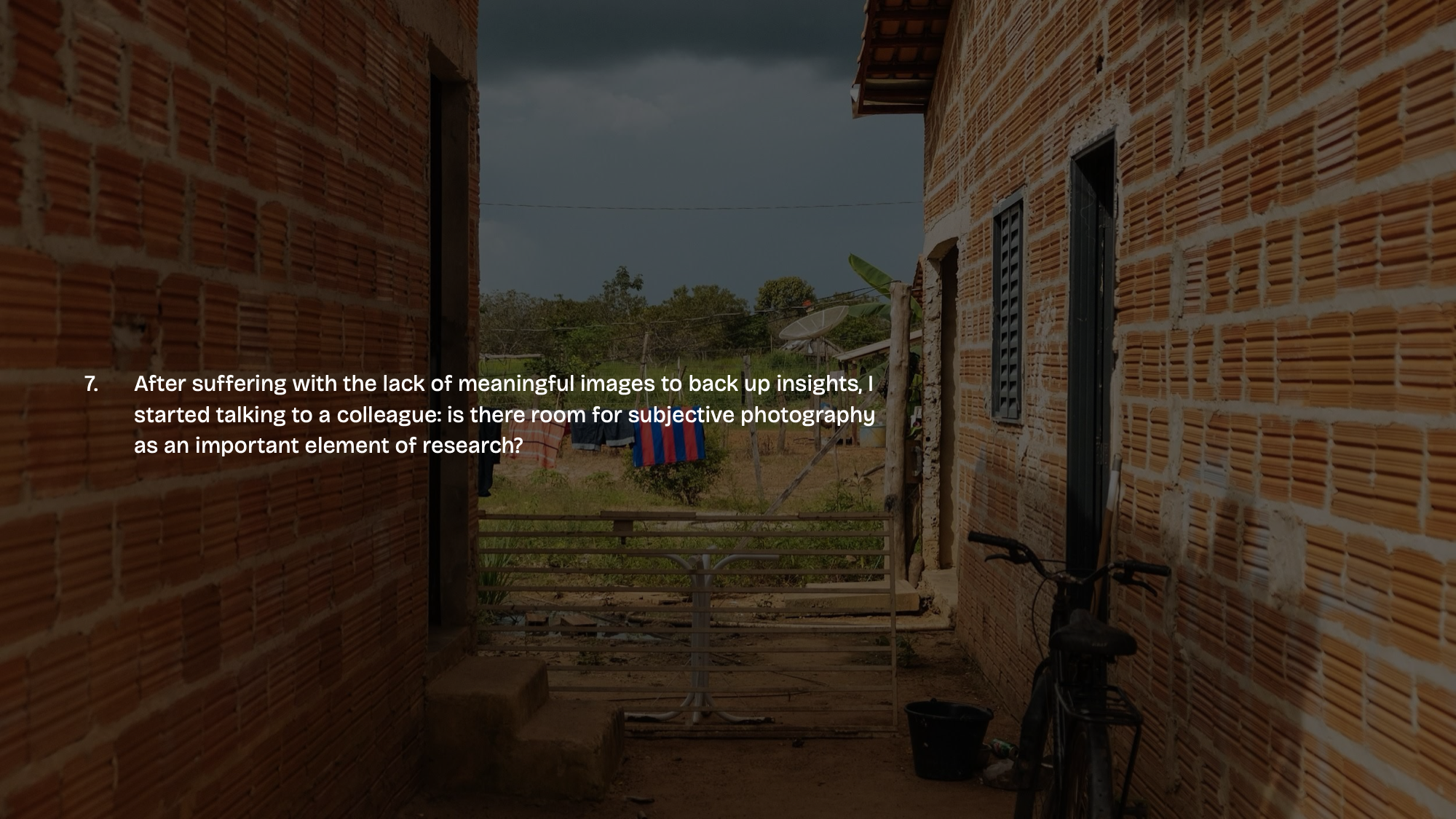 - After suffering with the lack of meaningful images to back up insights, I started talking to a colleague: is there room for subjective photography as an important element of research?