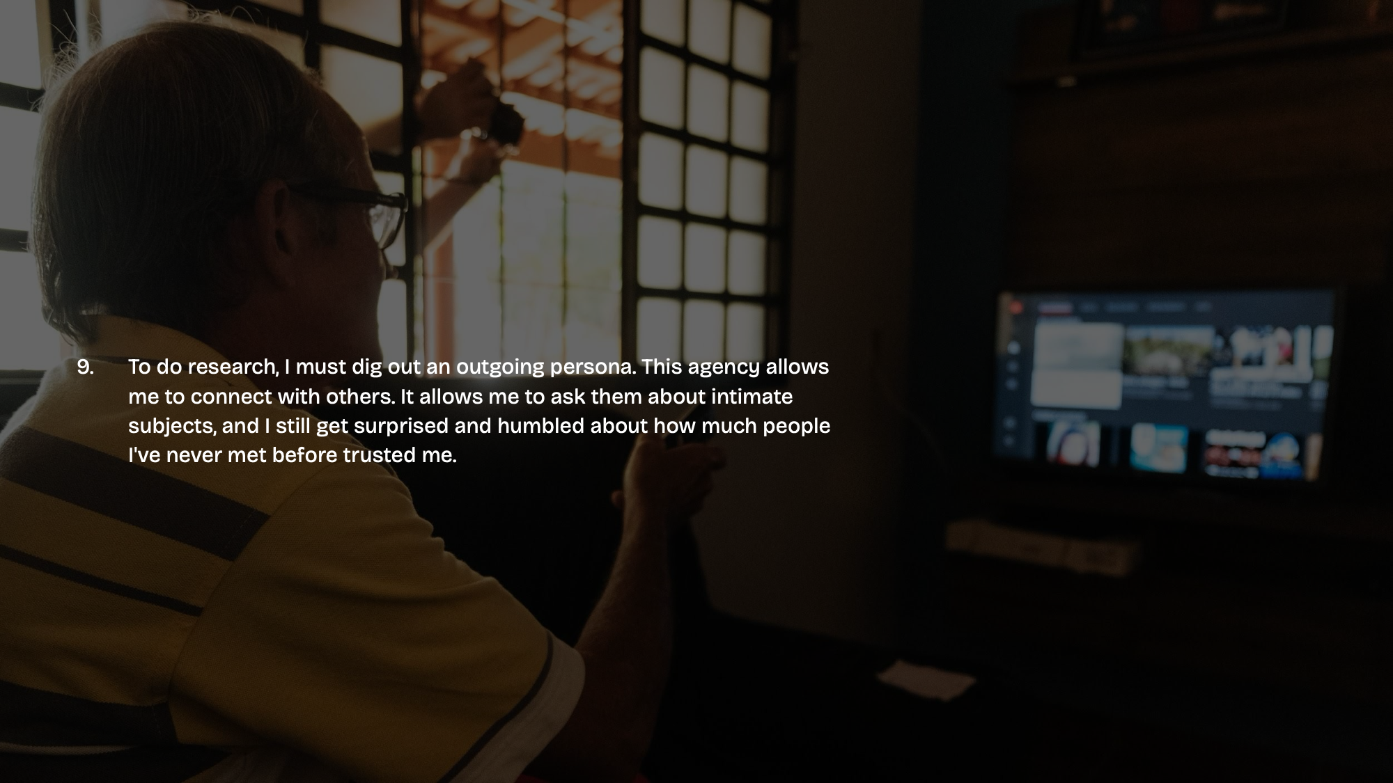 - To do research, I must dig out an outgoing persona. This agency allows me to connect with others. It allows me to ask them about intimate subjects, and I still get surprised and humbled about how much people I’ve never met before trusted me.