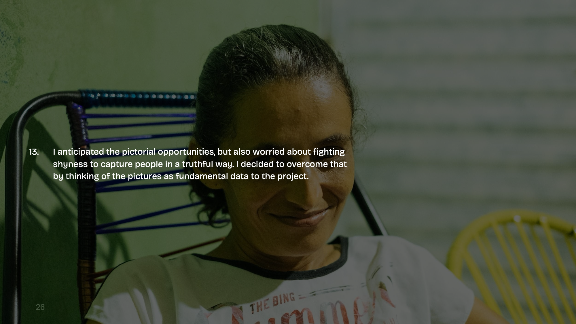 - I anticipated the pictorial opportunities, but also worried about fighting shyness to capture people in a truthful way. I decided to overcome that by thinking of the pictures as fundamental data to the project.