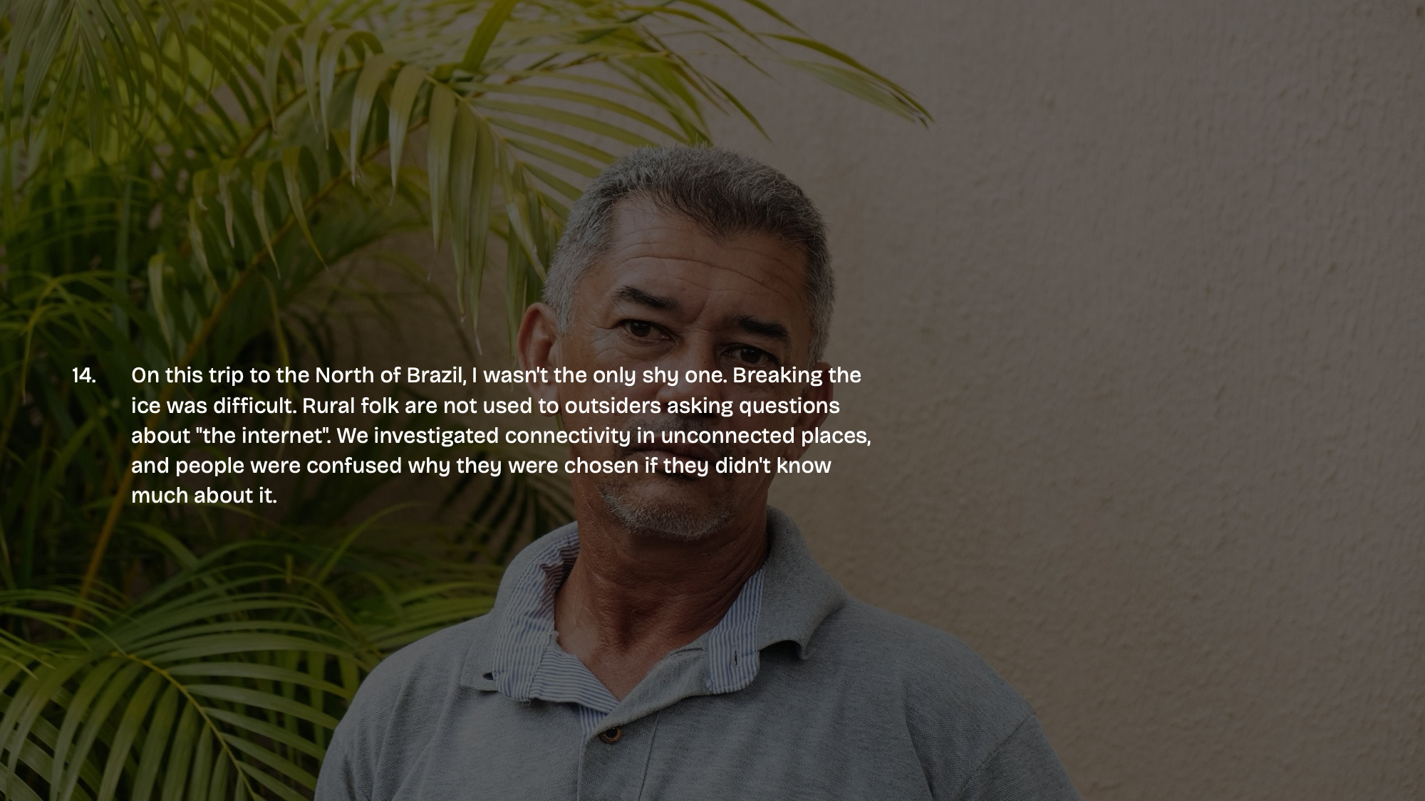 - On this trip to the North of Brazil, I wasn’t the only shy one. Breaking the ice was difficult. Rural folk are not used to outsiders asking questions about “the internet”. We investigated connectivity in unconnected places, and people were confused why they were chosen if they didn’t know much about it.