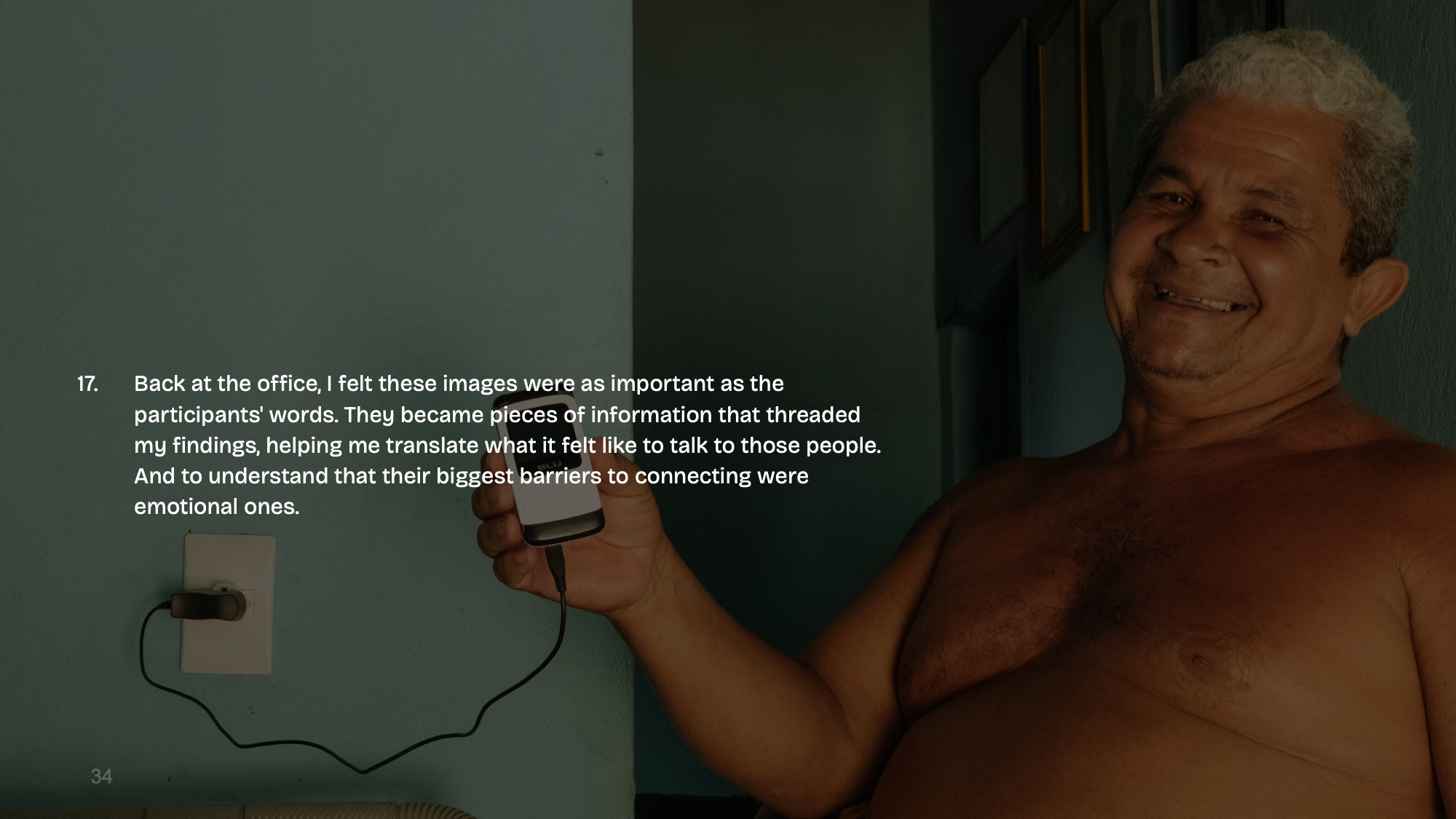 - Back at the office, I felt these images were as important as the participants’ words. They became pieces of information that threaded my findings, helping me translate what it felt like to talk to those people. And to understand that their biggest barriers to connecting were emotional ones.