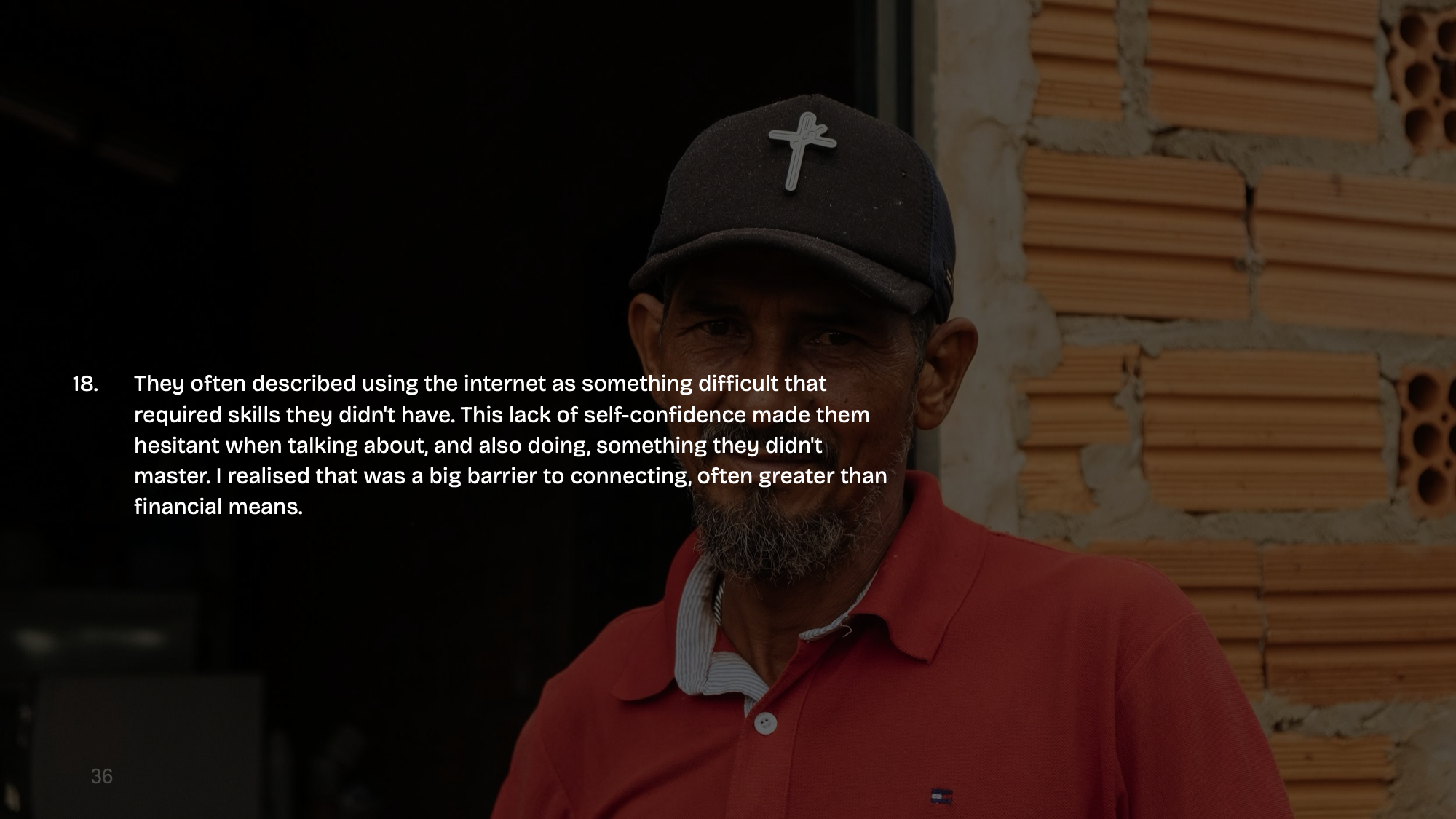 - They often described using the internet as something difficult that required skills they didn’t have. This lack of self-confidence made them hesitant when talking about, and also doing, something they didn’t master. I realised that was a big barrier to connecting, often greater than financial means.