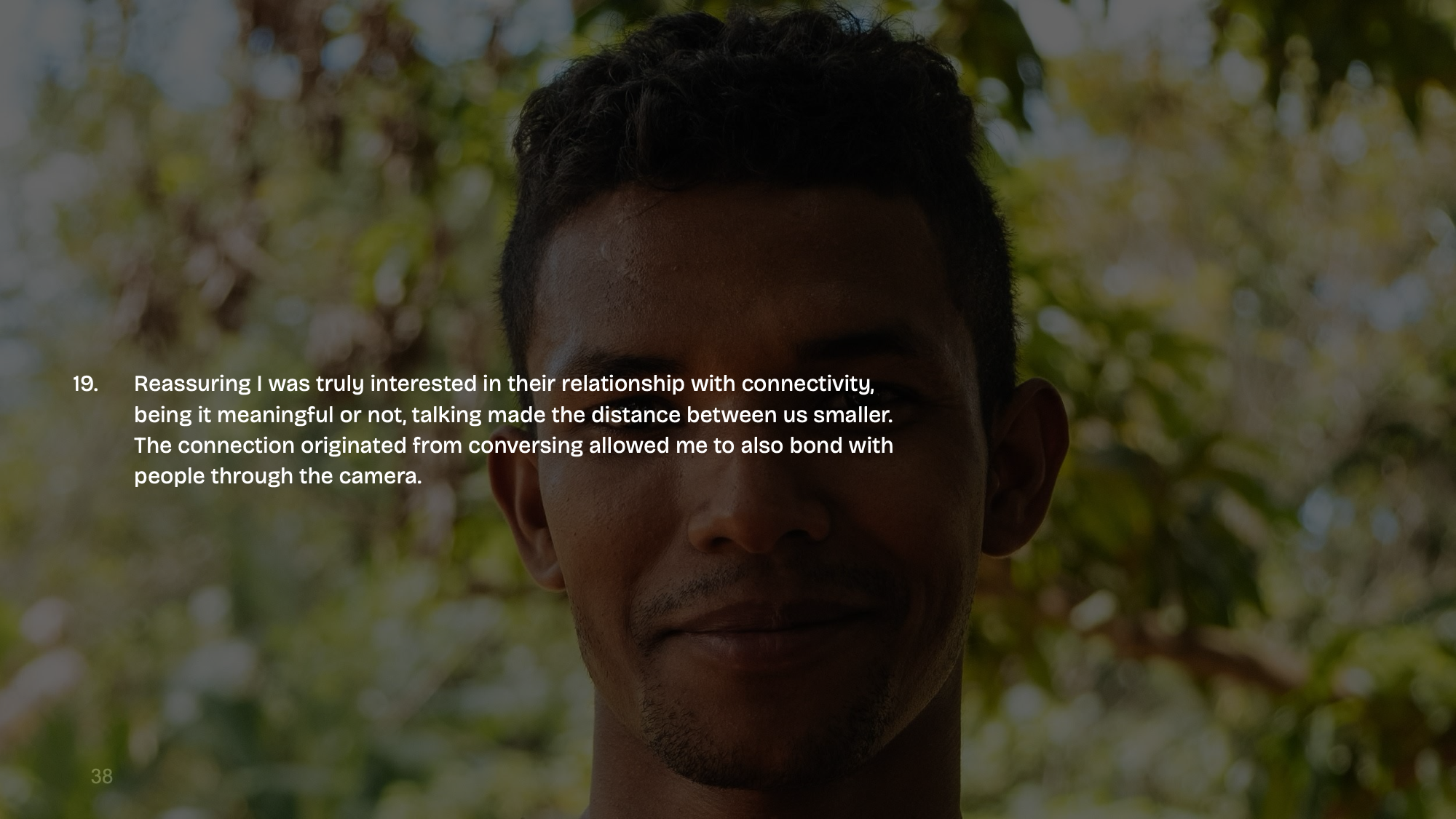 - Reassuring I was truly interested in their relationship with connectivity, being it meaningful or not, talking made the distance between us smaller. The connection originated from conversing allowed me to also bond with people through the camera.